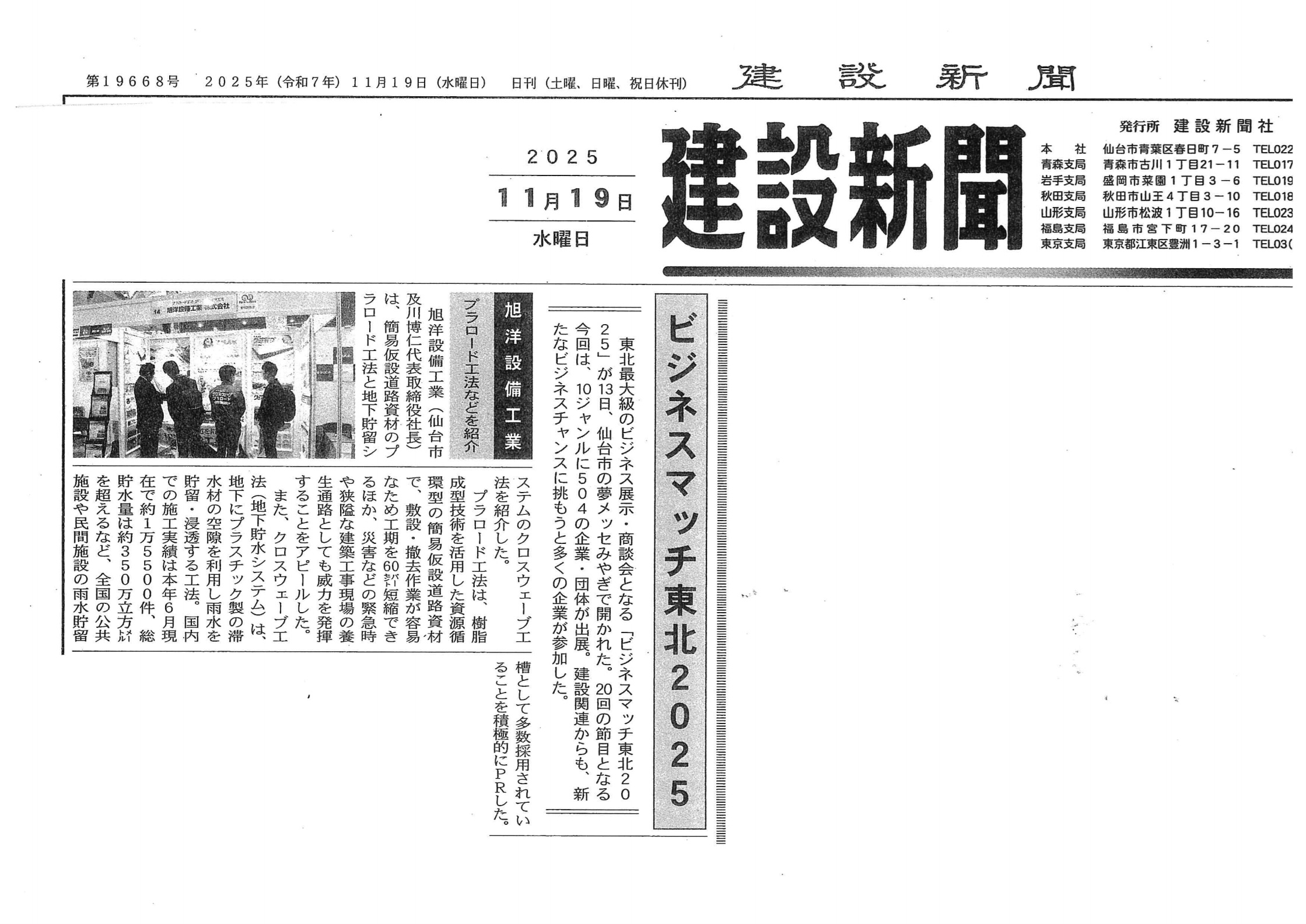 2025年11月19日(水)発行の建設新聞(8面) に、弊社が出展した「ビジネスマッチ東北2025」についての記事を掲載いただきました。