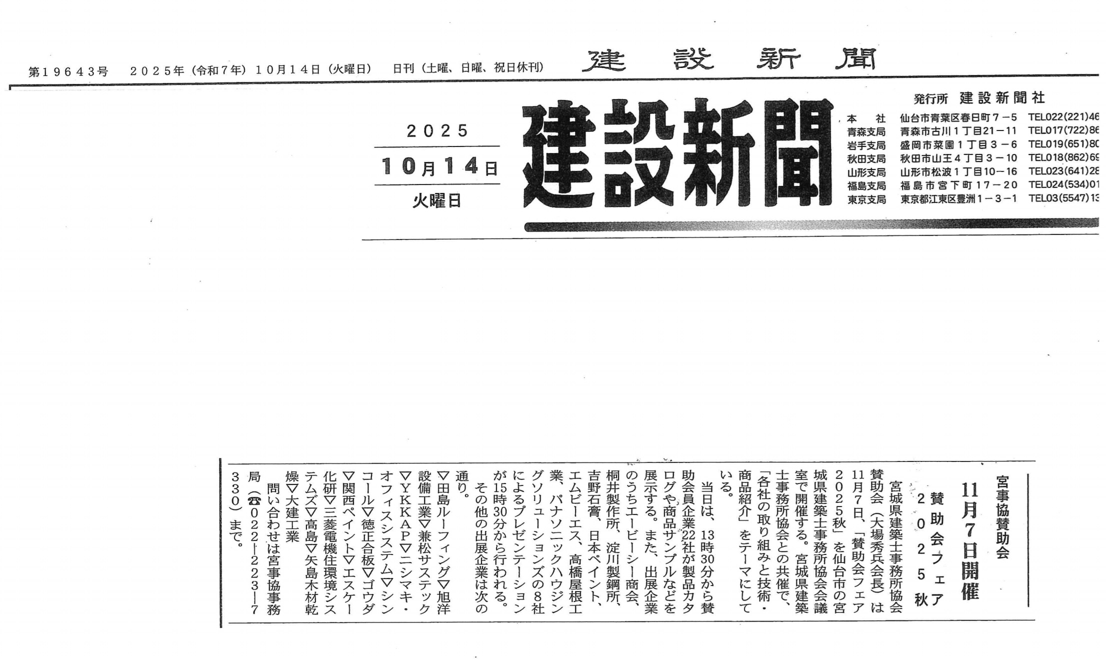 「宮城県建築士事務所協会様主催 賛助会フェア2025 第2回 11月7日(金)」に出展します!(お知らせ)