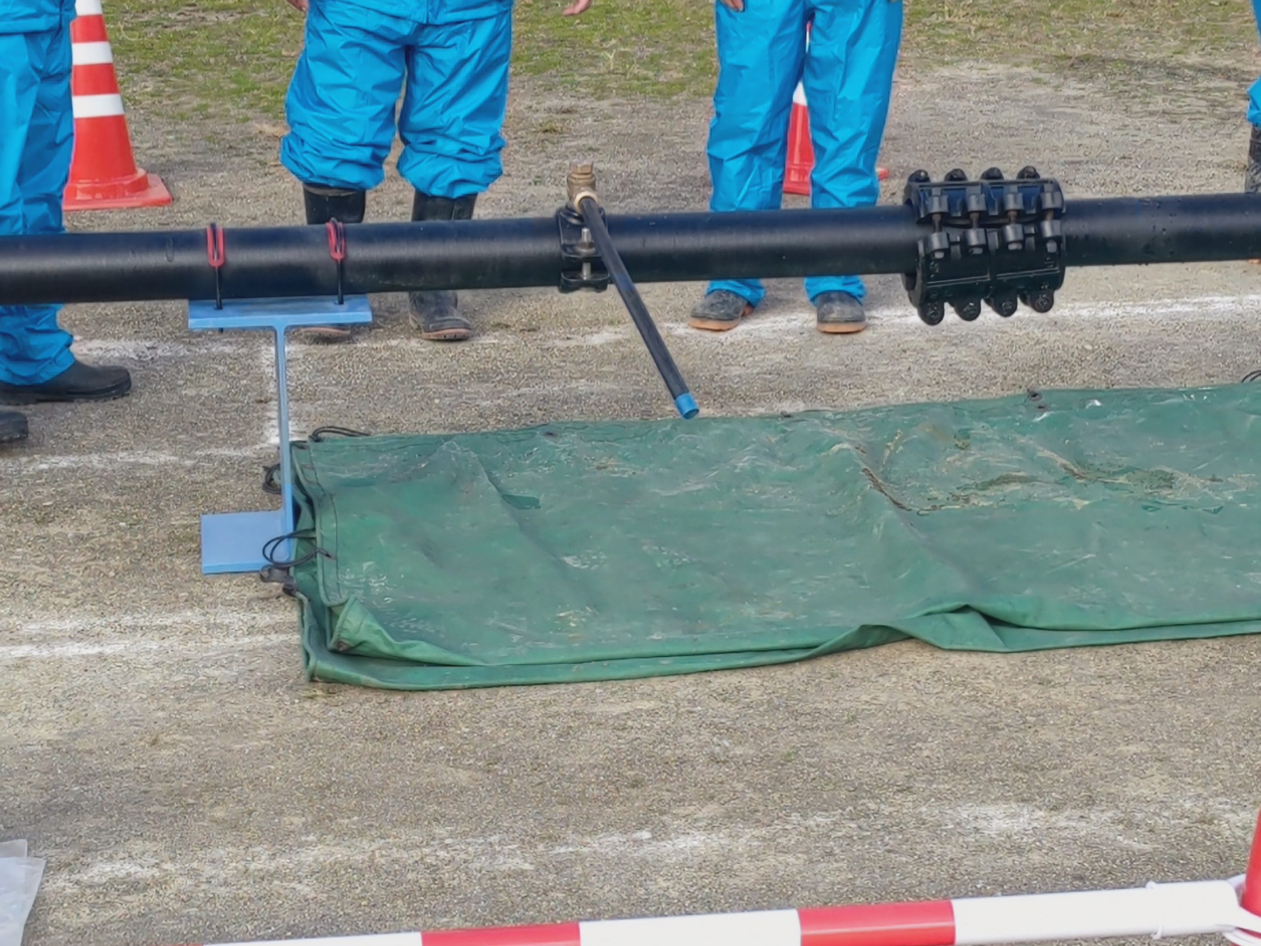 応急給水訓練では断水により災害時の給水栓が使用できない場合に水をためる「仮設水槽」の組み立てほか、災害応援で派遣された給水車から飲料水を受け渡すまでの流れを確認しました。